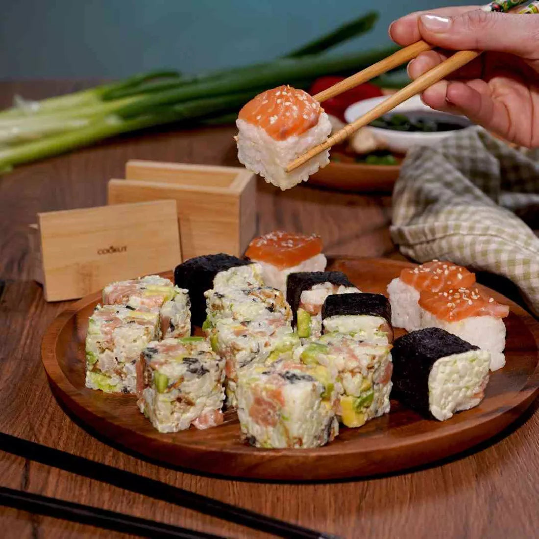 Maak gemakkelijk sushi met dit bamboeblokje van Cookut. Deze kubus is eenvoudig te gebruiken en maakt het mogelijk om je favoriete sushi te comprimeren en nog veel meer! (Klik op Details voor meer informatie.)