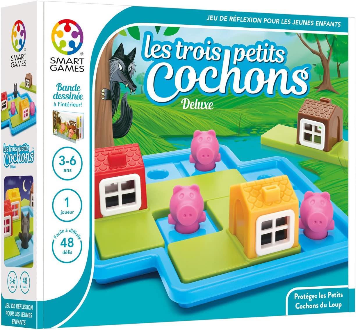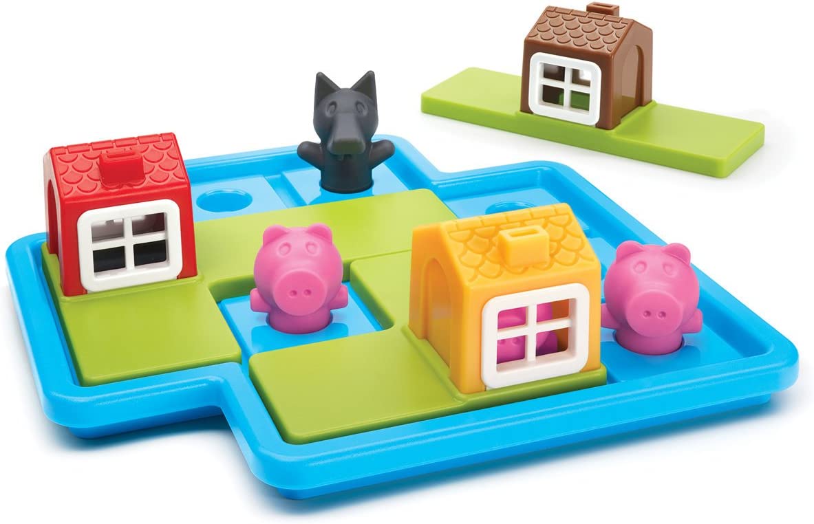 Het spel "3 biggetjes" is een spel van logica en reflectie dankzij de stukken die groot genoeg zijn om gemakkelijk te hanteren. Er zijn 2 spelniveaus: met en zonder wolf. In de versie zonder wolf moeten de varkentjes op het bord naast hun huis worden geplaatst om buiten te spelen. Als de wolf er is, moeten de huisjes op de varkentjes worden geplaatst om ze te beschermen.