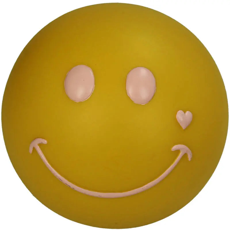 Het gele LED-smiley-ornament van polyhars brengt licht en vrolijkheid in huis. Dit kleine, lichtgevende, lachende gezichtje van polyhars, met afmetingen van 15,5 x 15,5 x 13,5 cm, voegt een speelse en vrolijke touch toe aan je interieur en is perfect voor een kantoor, slaapkamer of knusse hoek.