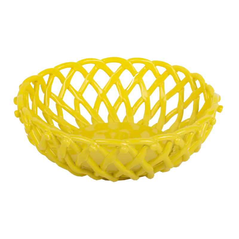 Het elegante gevlochten ontwerp van deze ronde, gele porseleinen mand maakt het een perfect accessoire voor het opbergen van fruit, kleine voorwerpen of dagelijkse accessoires , terwijl het tegelijkertijd een decoratief tintje toevoegt aan uw ruimte.