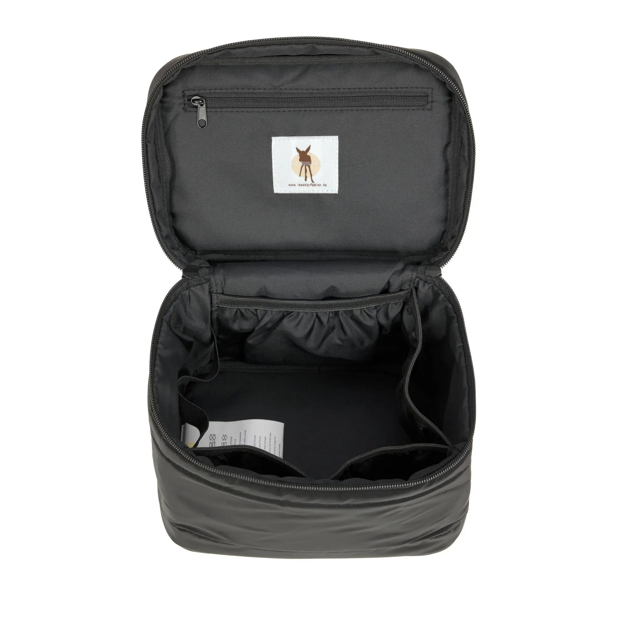 Dankzij de grote ritsopening en de lichtgekleurde binnenvoering is elk toiletartikel zichtbaar en gemakkelijk bereikbaar. Het hoofdvak heeft zijvakken en elastische strikbanden , terwijl kleine accessoires zoals sokken en fopspenen in het ritsvak van de klep kunnen worden opgeborgen.