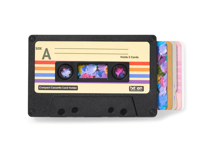 Een pasjeshouder met het uiterlijk van een audiocassette om al je bankpasjes in te bewaren.