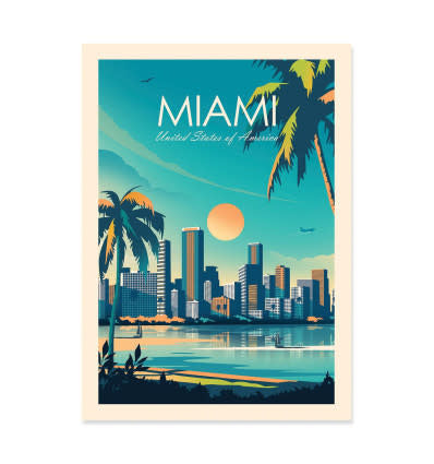 Studio Inception maakt Travel Posters van iconische steden over de hele wereld. Hier Miami in Florida, in deze prachtige kleur.