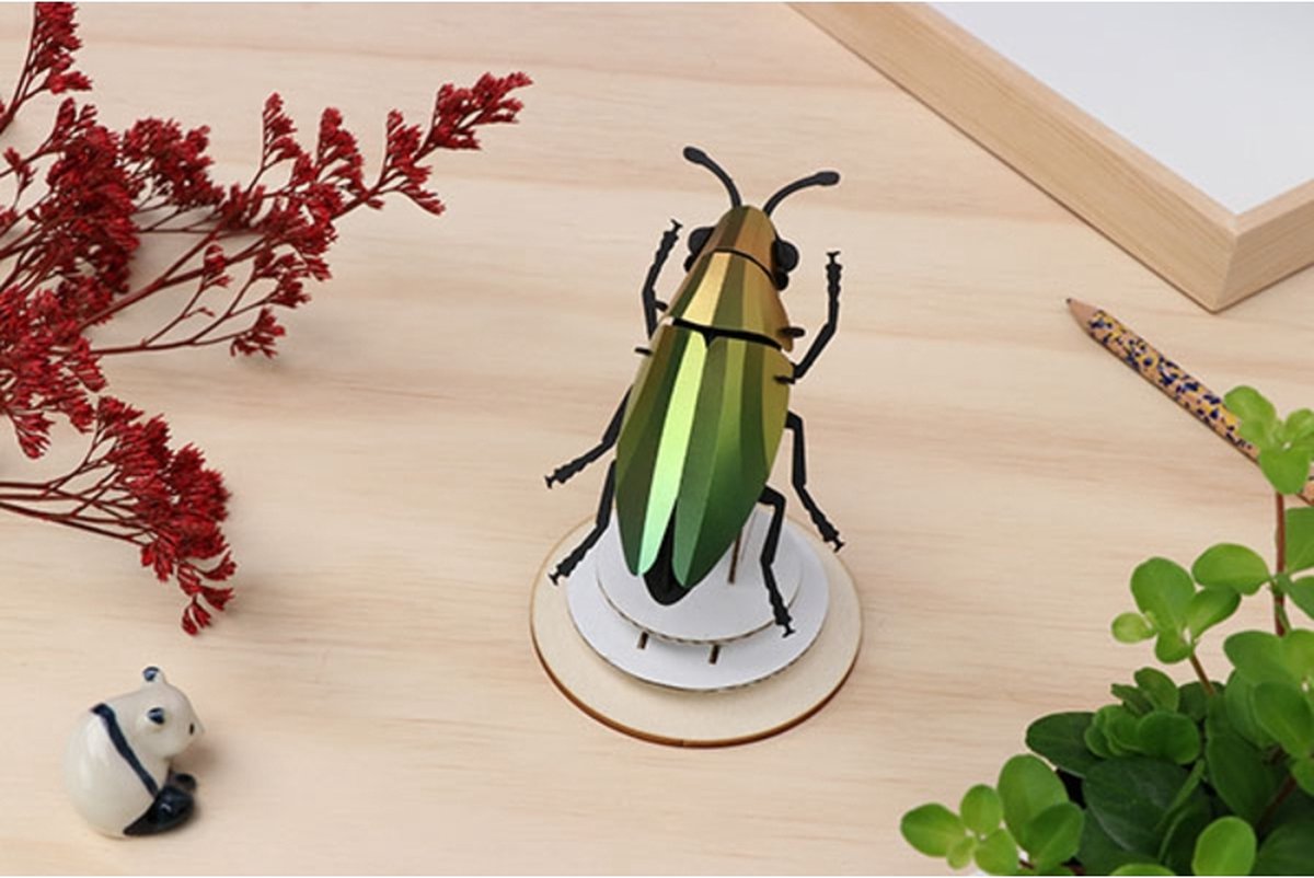 DIY-pakket om een 3D-papieren mangogroene juweelkever in elkaar te zetten
