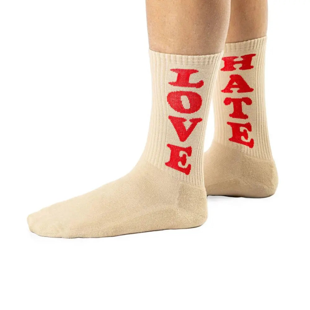 Geef je outfit een subtiel maar gedurfd accent met de Love and Hate unisex sokken. Deze sokken zijn ontworpen om stijl en comfort te combineren en dragen een boodschap uit die zowel teder als rebels is en zeker niet onopgemerkt zal blijven.