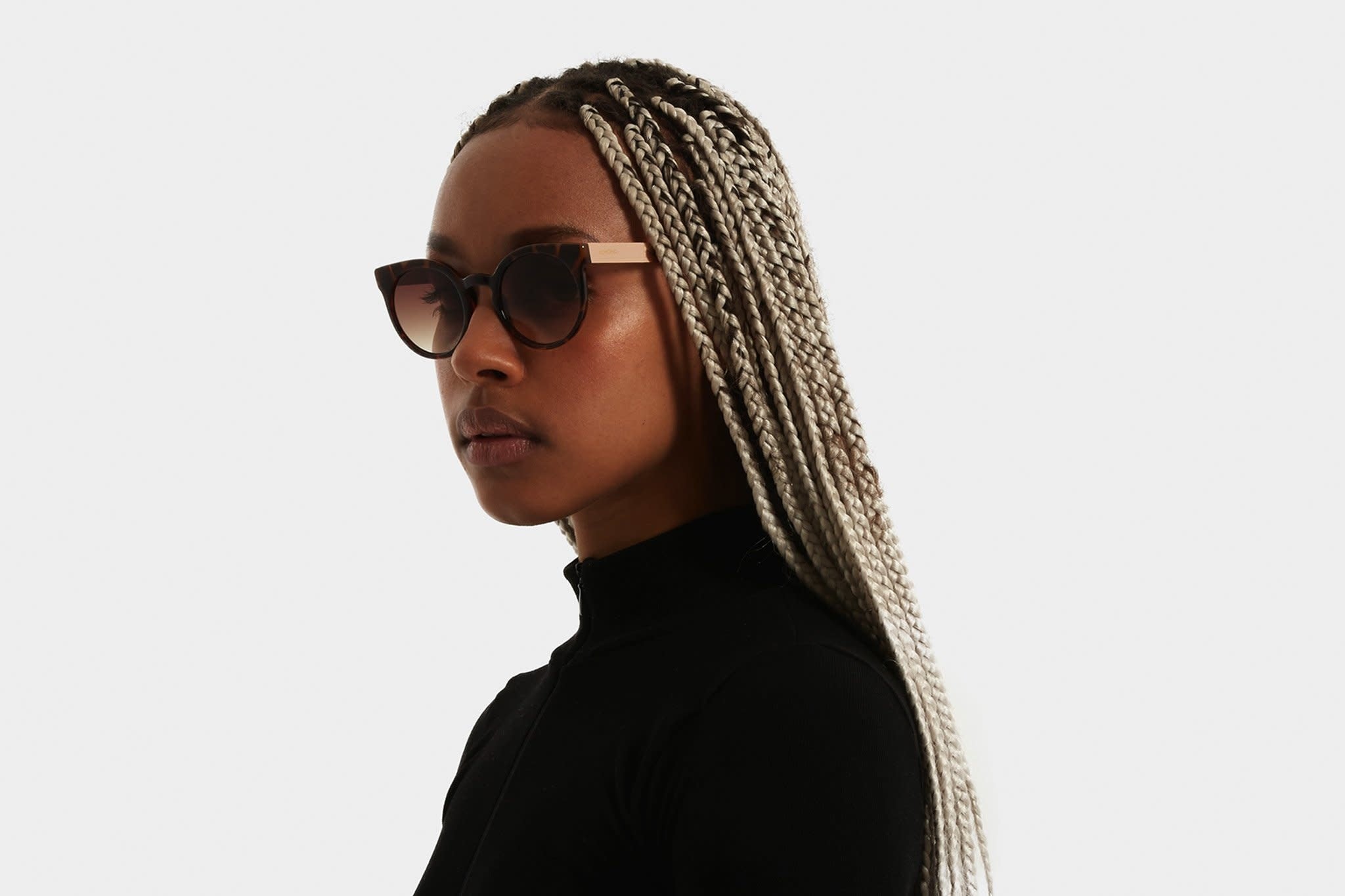 Wie heeft vintage nodig als je Lulu kunt hebben? Eigentijdse en modieuze cat-eye zonnebril met KOMONO's kenmerkende minimalistische esthetiek.