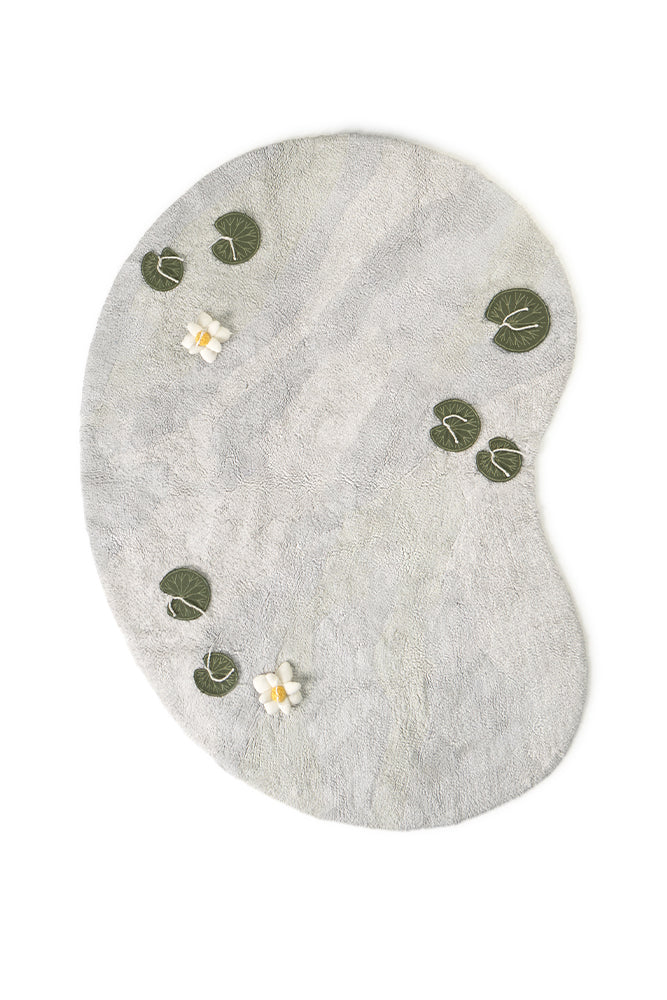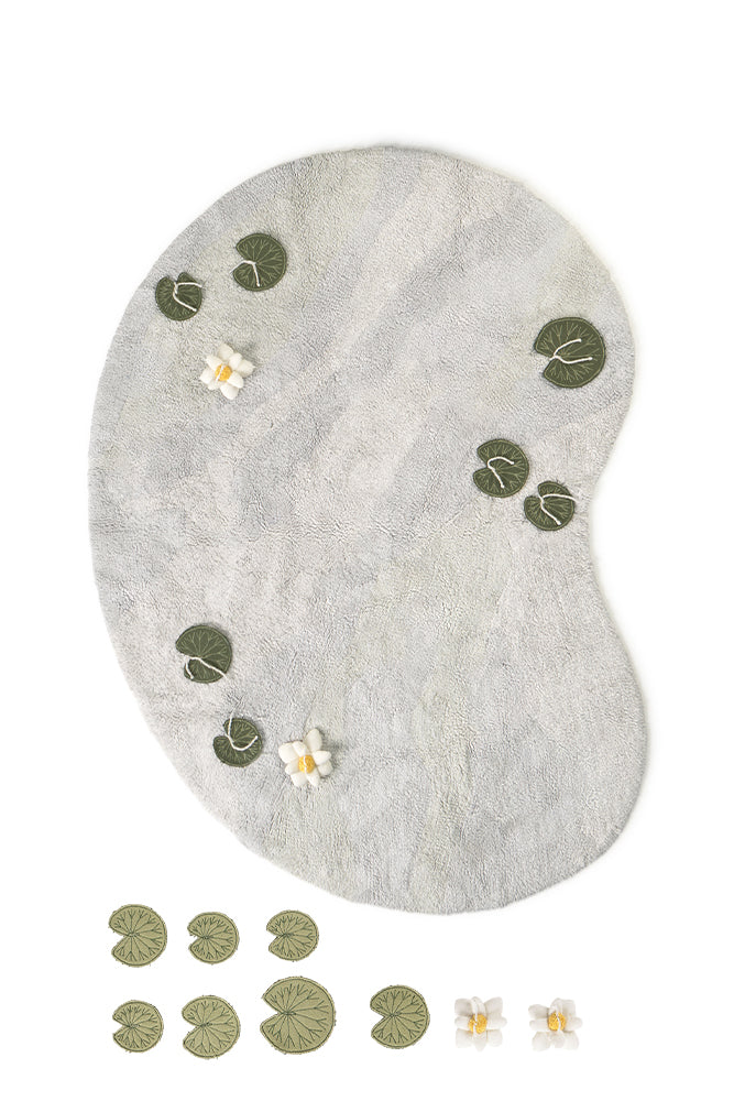De pomponbloemen zorgen voor een prettige textuur onder de vingers, en de waterlelies, vastgezet met de draden van het tapijt zelf, voegen een magische, handgemaakte touch toe.