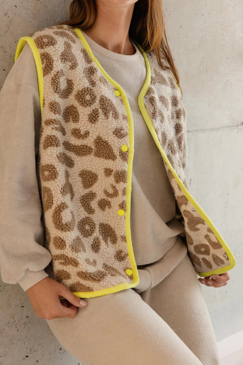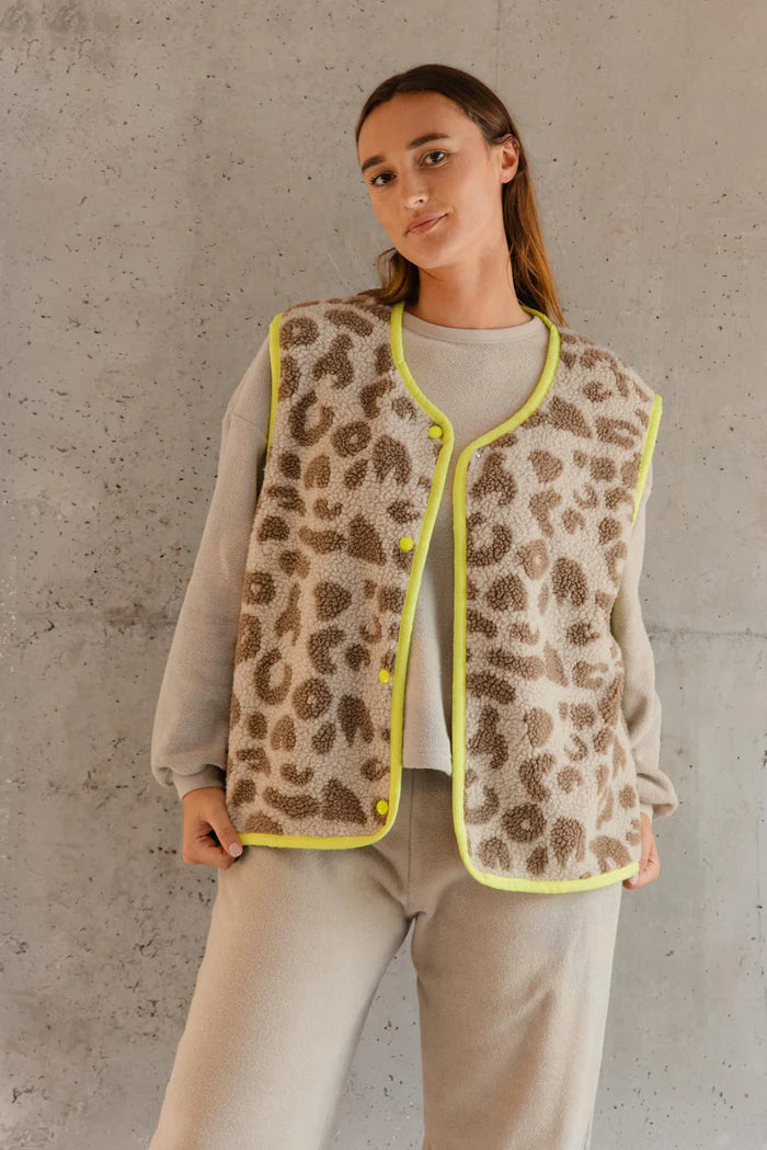 Waan je even terug in de tijd naar de jaren 80 met dit mouwloze fleecejack met luipaardprint! Zacht en opvallend, combineert het een behaaglijk pluche effect met een vleugje neon-citroen om het grijze weer op te vrolijken. Het is het perfecte item om een vleugje speelsheid toe te voegen aan een nette jeans of een soepele jurk.