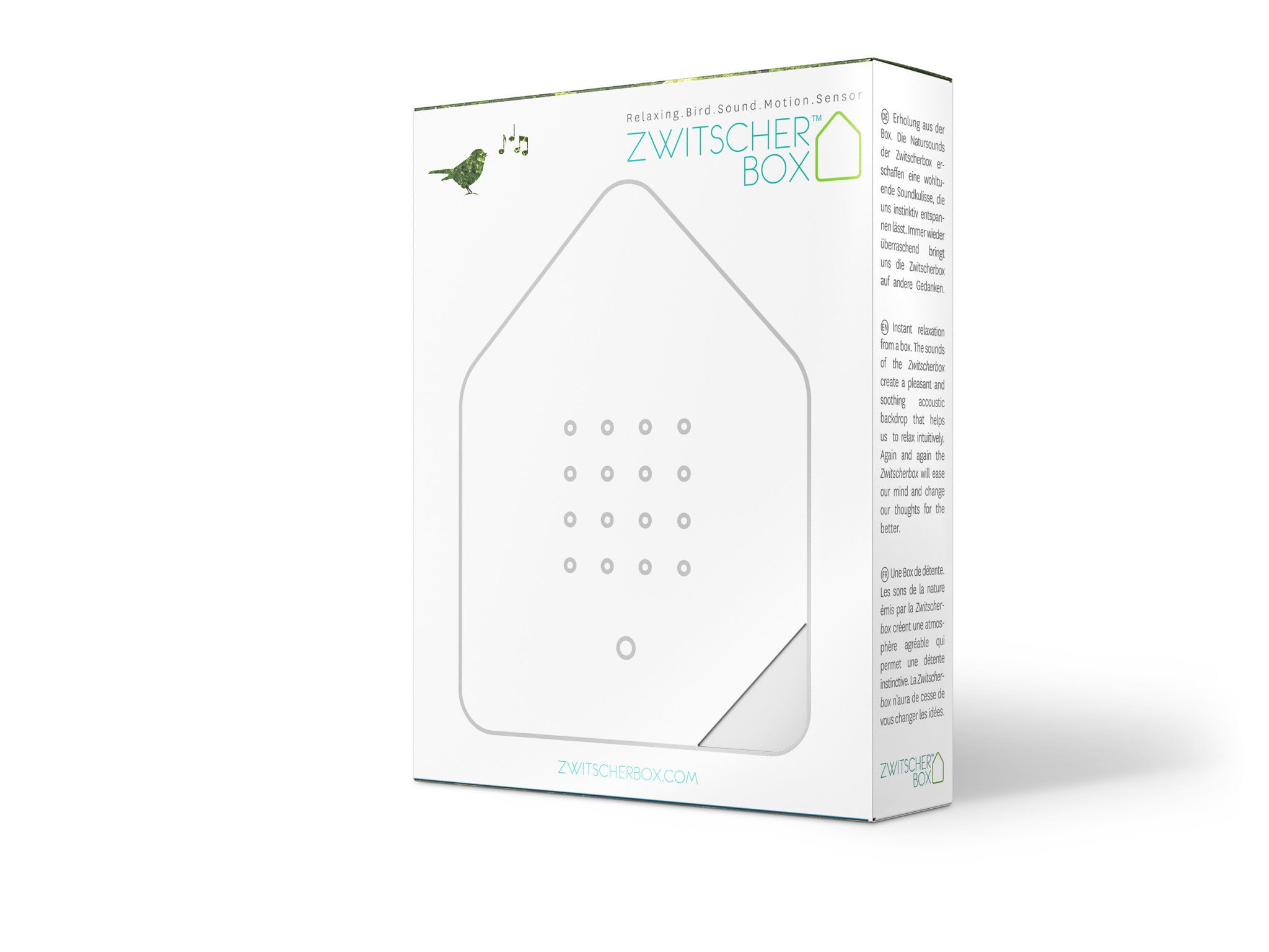 Natuurlijke geluiden worden geactiveerd door een bewegingsdetector als je langs de box loopt. Het volume kan individueel worden aangepast. Dankzij het compacte formaat en de handige werking op batterijen kun je overal genieten van het effect van je Zwitscherbox. Je kunt hem naast het koffiezetapparaat zetten, op een plank, op een bureau of bij het raam: een moment van ontspanning is altijd welkom, waar je ook bent.