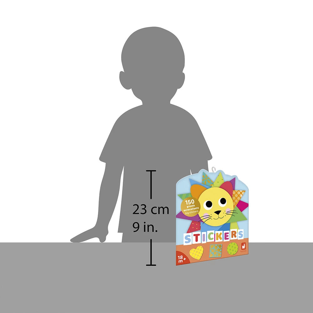 Avec 6 planches colorées et 9 formes différentes, ces stickers sont spécialement conçus pour les petites mains. Le joli pack en forme de lion contient des gommettes repositionnables, pour un jeu à la fois amusant et pédagogique.