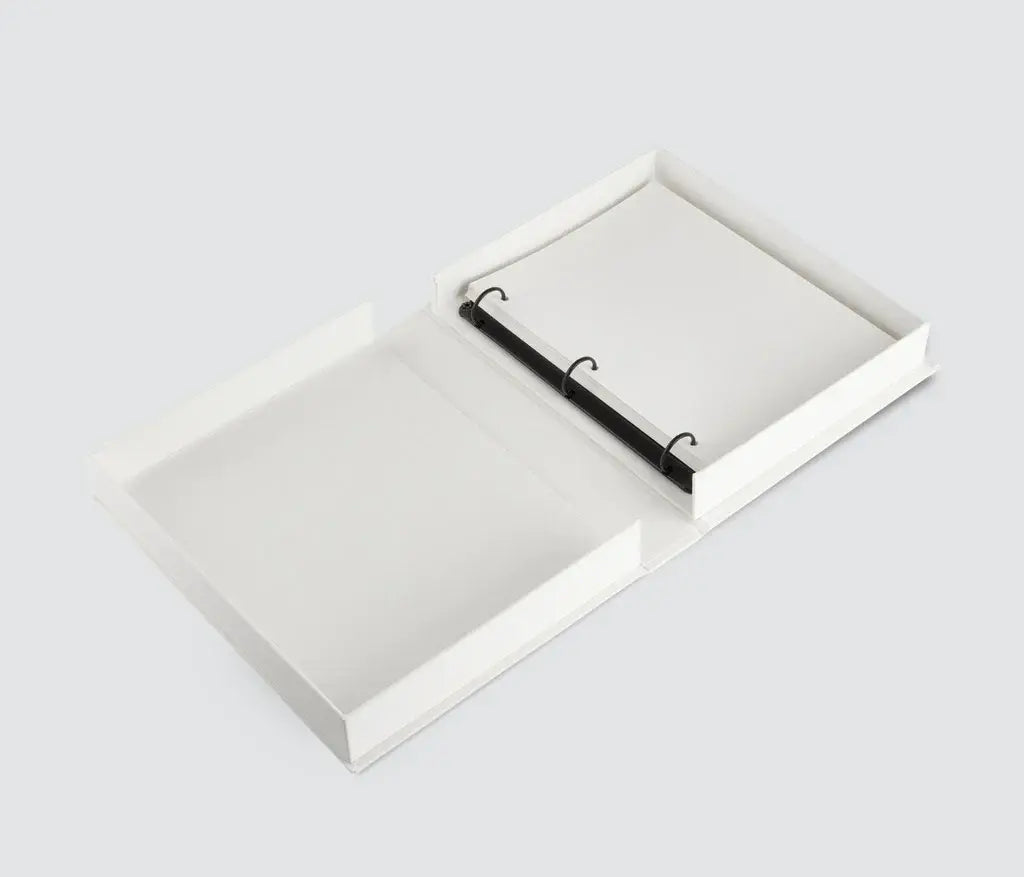 - Matériau : Couverture : 100% coton + carton gris recyclé. Pages : carton noir FSC, sans acide. Reliure en métal noir.