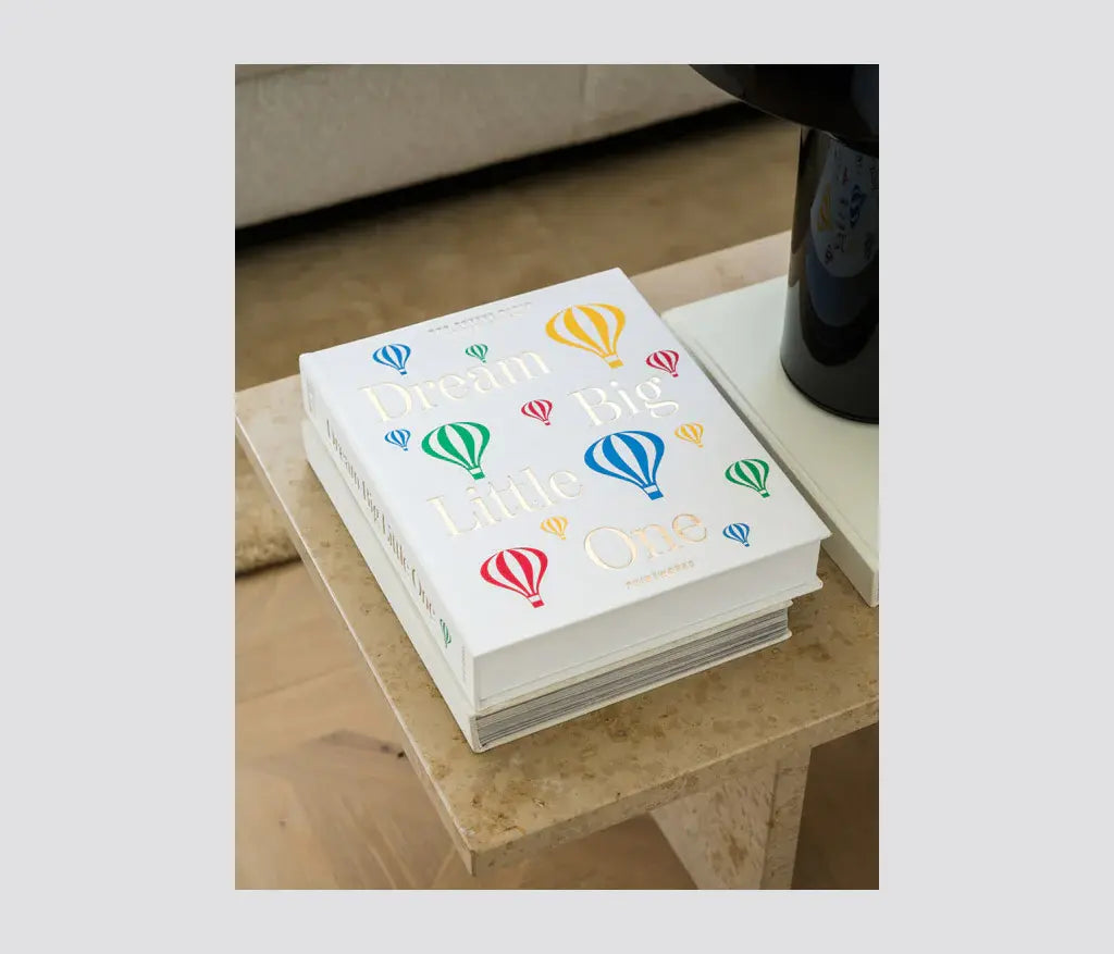 - Dream Big Little One est recouvert d'un tissu beige, avec un texte doré et des ballons sérigraphiés en plusieurs couleurs.