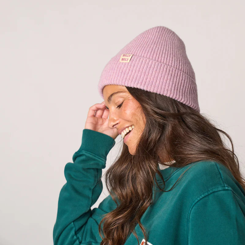 Bonnet 100% laine de mouton violet, doux, chaud et extensible, avec logo BILLYBELT coloré pour un look stylé en hiver.