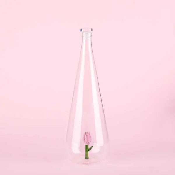 Avec sa tulipe rose cette bouteille en verre est bien plus quâun simple contenant.
