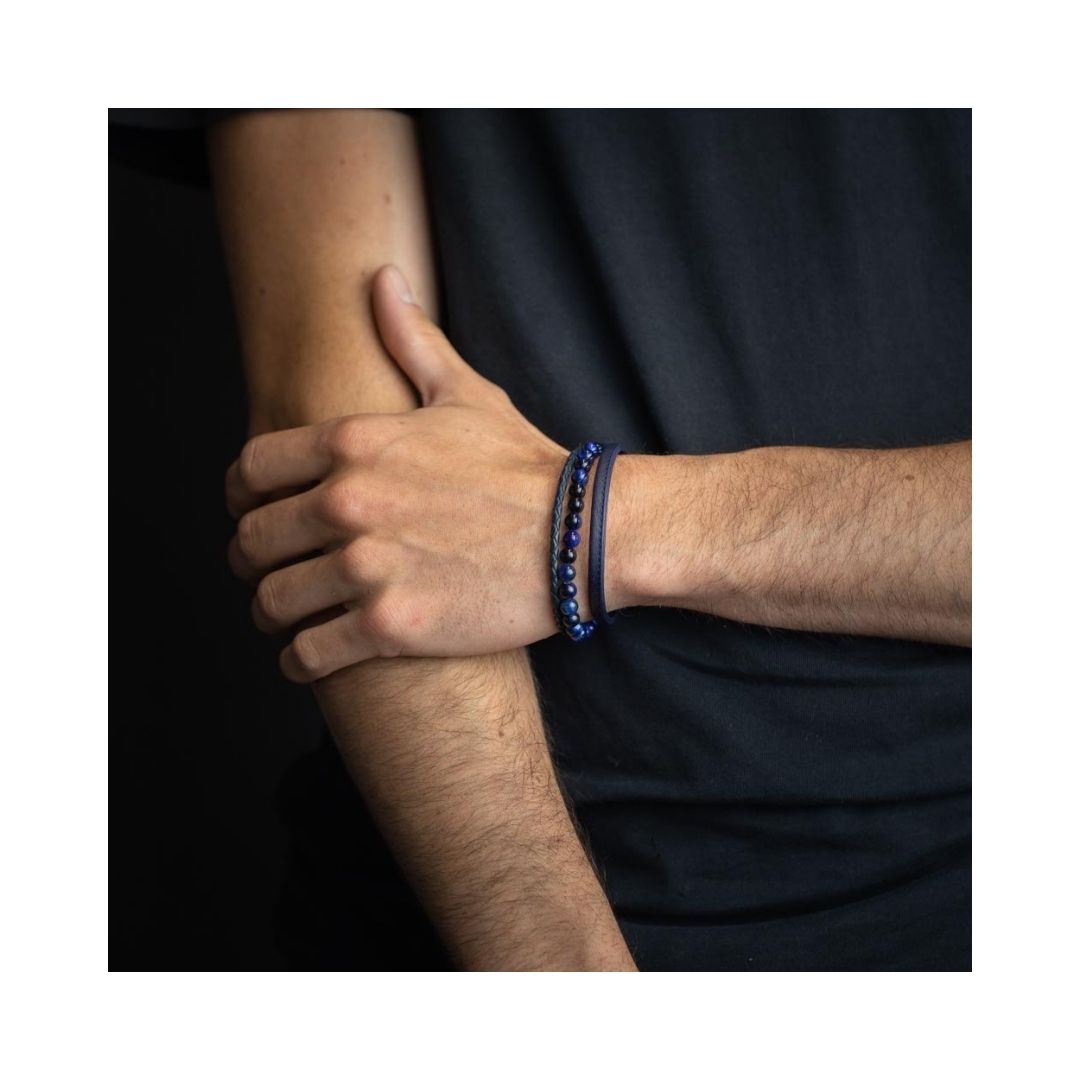Bracelet Triple Cuir & Pierre d'Œil de Tigre Bleu