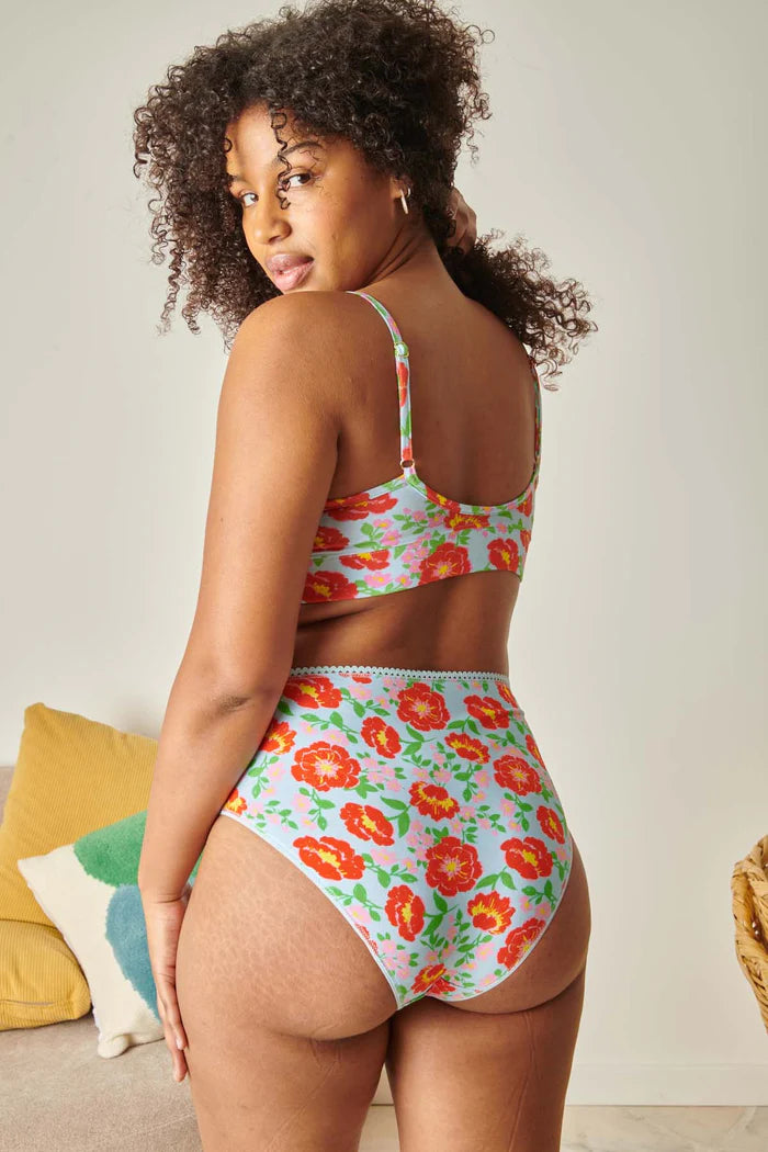 Des fleurs qui boostent la confiance ✨ Cette brassière Rosa, avec son imprimé éclatant et son fond bleu ciel, est un vrai shot de bonne humeur. Ultra douce, bien couvrante et hyper agréable à porter, elle offre un maintien léger idéal du bonnet A au D. Le mix parfait entre confort, style et jolies vibes.