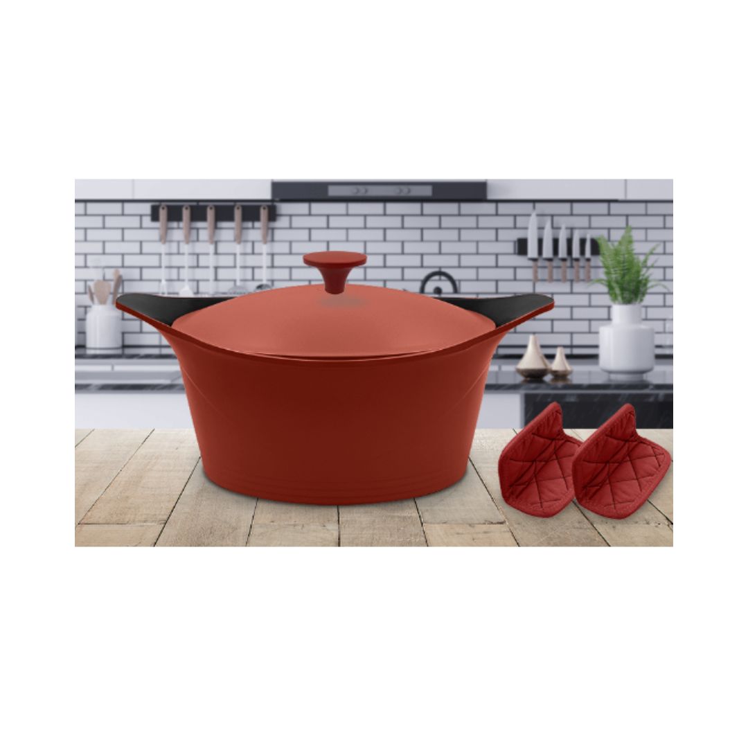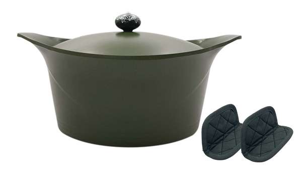 Cocotte durable, écologique et saine fabriquée en fonte d'aluminium, entièrement encapsulée dans un revêtement minéral antiadhésif résistant. Pas besoin de graisse pour cuisiner avec cette casserole. Fabriqué en sable vitrifié, le revêtement ne se décolore pas, ne se raye pas et ne se tache pas. Même les sauces les plus colorées ne l'intimident pas ! Bien qu'elle soit compatible avec le lave-vaisselle, le revêtement permet de la laver facilement à la main.