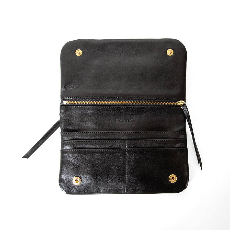 Compact, élégant, organisé : le compagnon Louisa en noir est l’allié idéal pour ranger cartes, monnaie et papiers avec style. Son cuir est tanné naturellement et travaillé à la main dans les ateliers marocains de Naterra. À la fois chic et responsable.