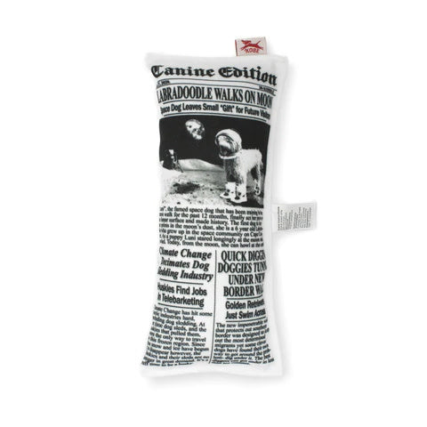 Le jouet Doggy Fake News est un amusant jouet à grincer pour les chiens de toutes tailles. Avec ses (faux) titres humoristiques sur les chiens, comme le célèbre "Labradoodle marche sur la lune", ce jouet est tout aussi amusant pour les maîtres que pour leurs amis à fourrure !