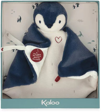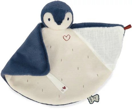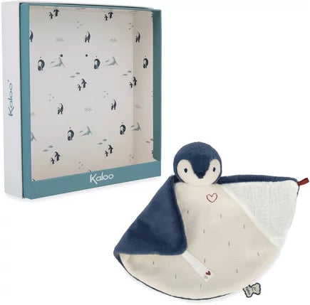 Le doudou manchot de la marque française Kaloo est à la fois doudou, à la fois jeu d'éveil des tous petits grâce à ses 3 différentes matières: