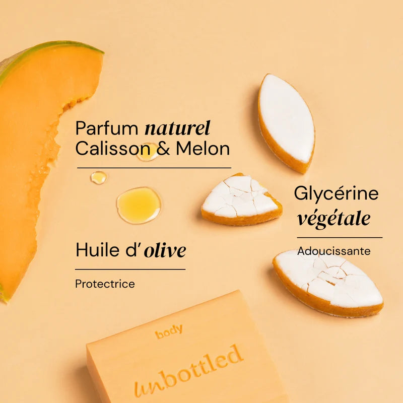 Plongez sous la douche avec le Gel Douche sans Bouteille Calisson et Melon d’Unbottled et transformez votre routine en un moment gourmand et doux pour la peau.