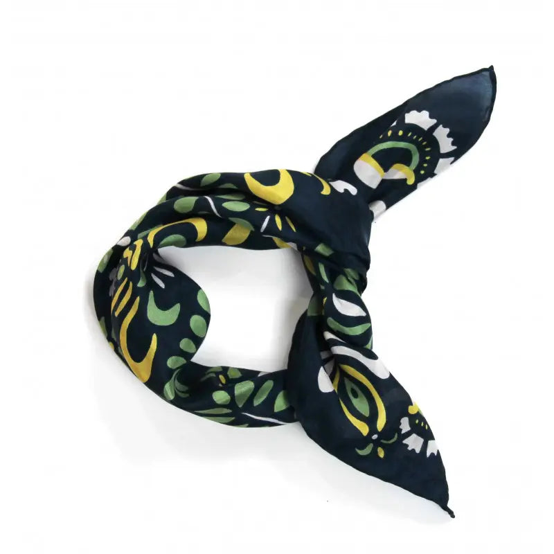 Imprimé dans un atelier socialement responsable avec des encres AZO free, le Mini Foulard Yulia Jaune respecte l’environnement et la santé. Chaque détail reflète l’engagement des Belles Vagabondes pour un artisanat responsable et de qualité.