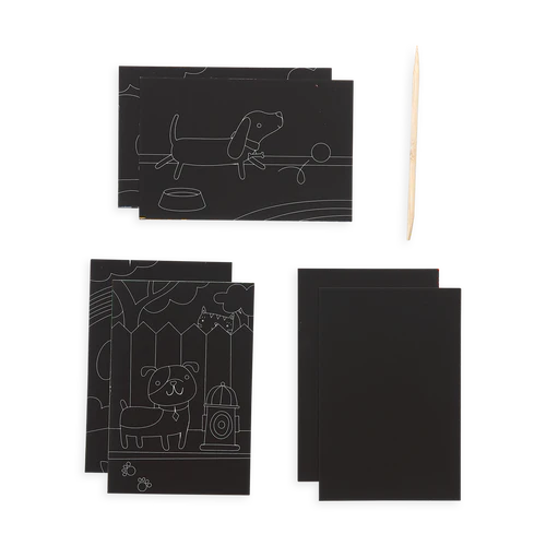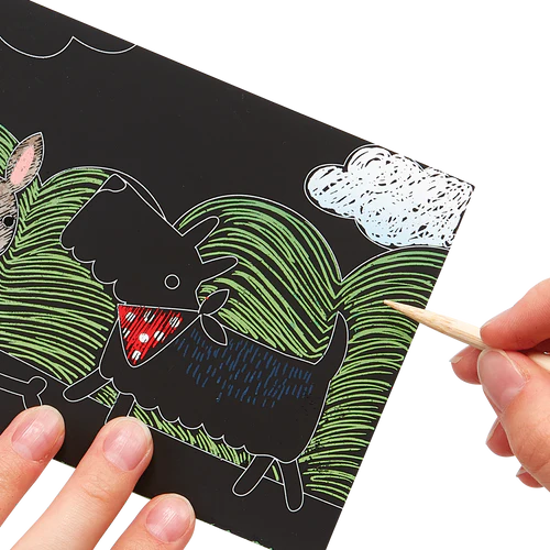 Gratte avec le stylet en bois inclus et découvre des dessins colorés cachés sous la surface noire. Une activité simple, sans taches, et pleine de surprises visuelles à chaque coup de griffe 🖍️✨