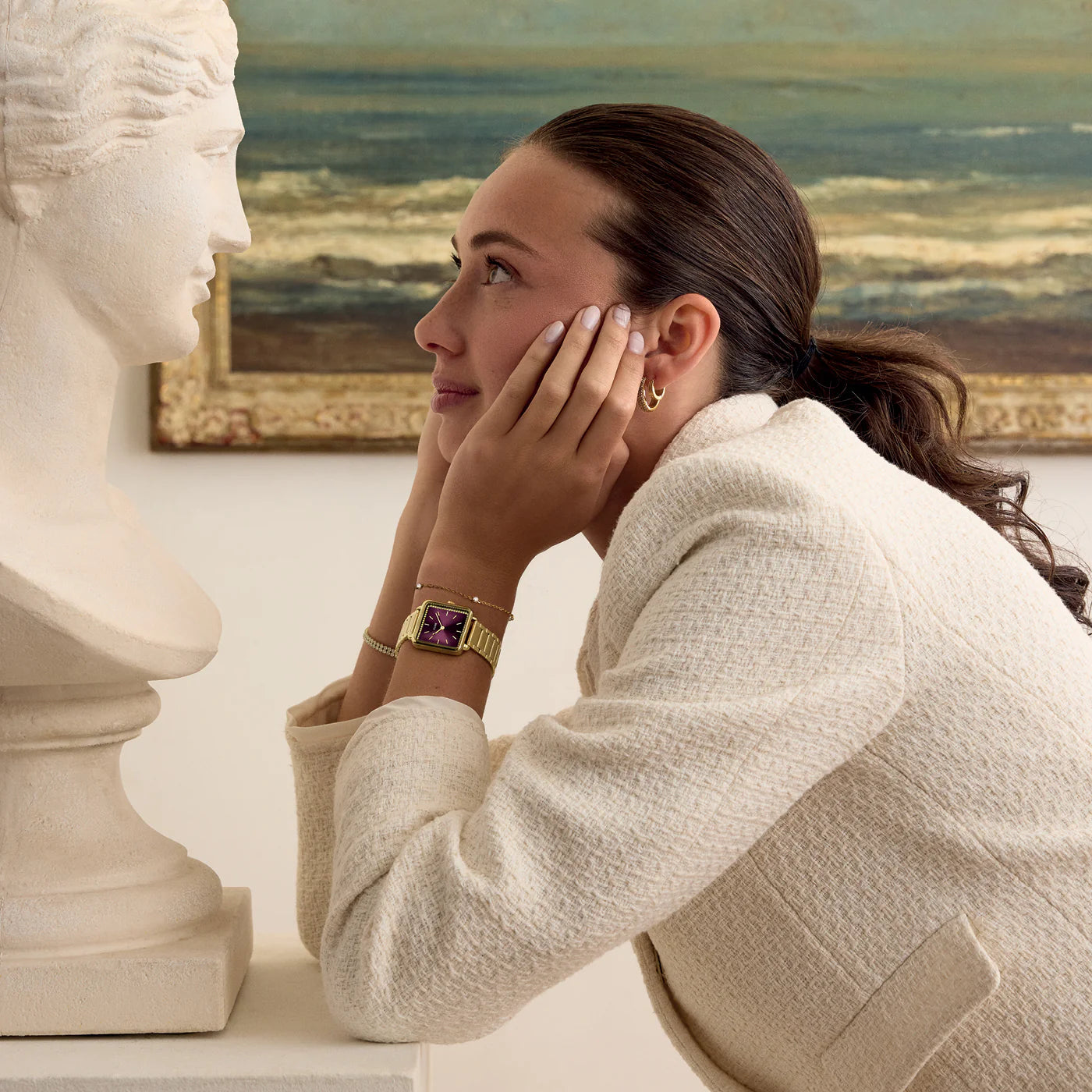 Symbole d’assurance et de raffinement, la montre La Tétragone séduit par son boîtier doré carré de 28,5 mm, délicatement associé à un bracelet en acier inoxydable doré de 16 mm. Son cadran rouge vin, rehaussé de pierres dorées scintillantes, capture la lumière et attire le regard, offrant un équilibre parfait entre sophistication et audace.