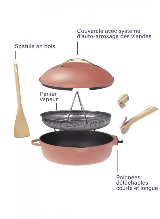 Sauteuse, casserole, cuiseur vapeur, friteuse, plat au four, poulets rôtis, cette poêle unique est certainement la pièce maîtresse de la marque. Un véritable "fait-tout", qui passe au four et est compatible avec tous feux, même induction.