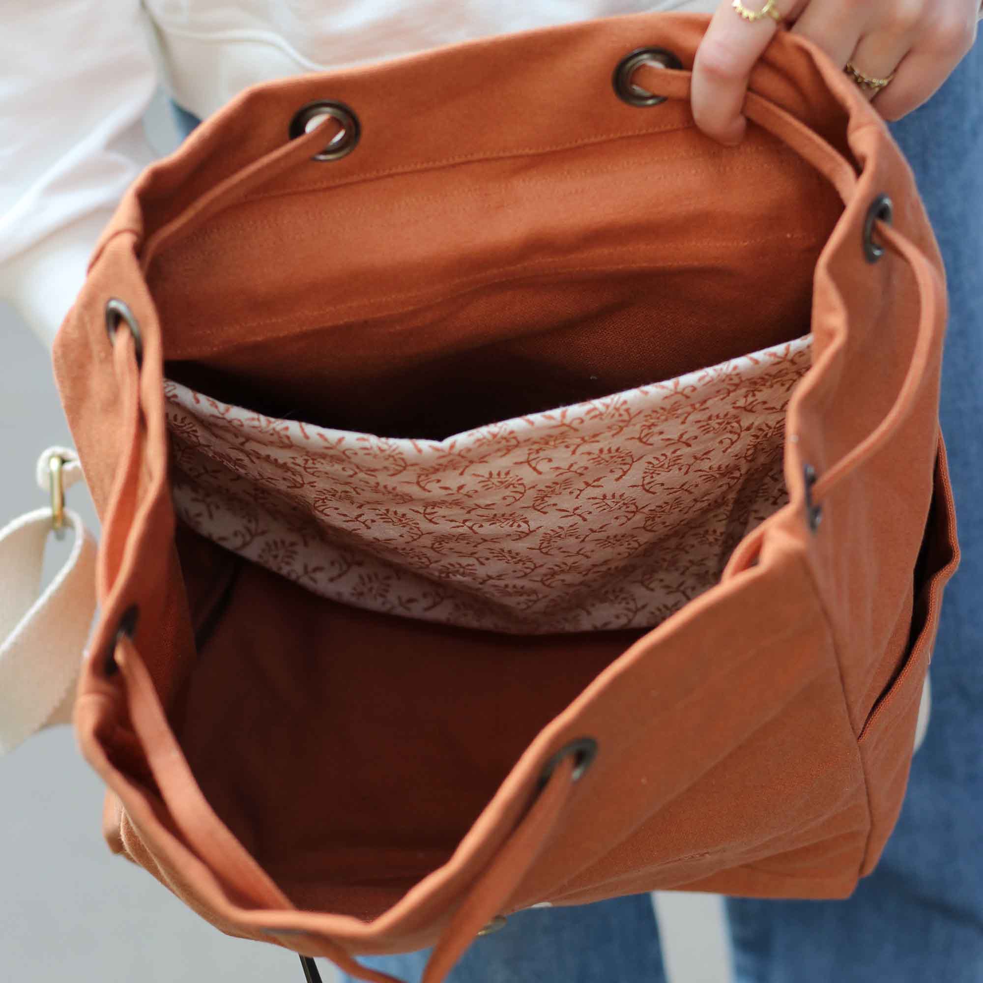 Le sac à dos est fabriqué en coton biologique épais. Il est doté de bretelles réglables, de multiples poches extérieures et d'un compartiment intérieur pour un ordinateur portable ou une tablette.
