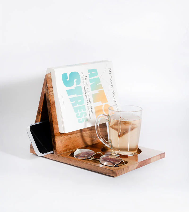 Un valet de lecture pratique et esthétique pour poser vos affaires lors de votre lecture, mais aussi votre livre. Gardez tout à portée de main pendant votre moment de lecture grâce à ce valet en bois. (Cliquez sur Détails pour plus d'informations.)