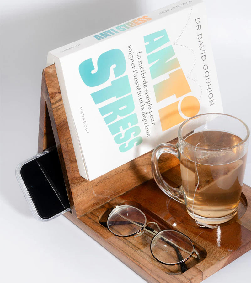 Il peut servir de petit plateau pour votre boisson et de petits objets, et dissimule votre smartphone pour vous aider à rester concentré. Le triangle, quant à lui, vous permet de poser votre livre afin de préserver votre page entre deux chapitres.