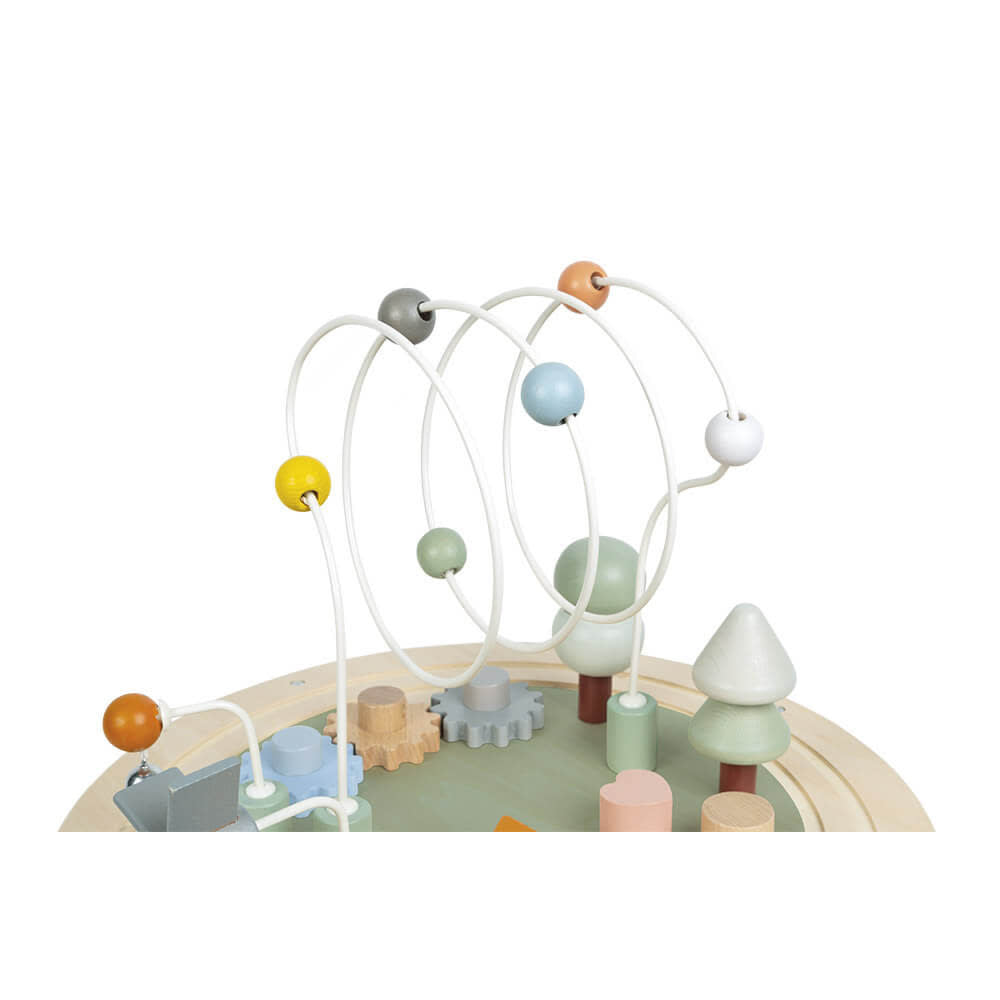 La table se compose d'une petit circuit avec 2 véhicules, 2 arbres à empiler, des looping, un moulin, une clochette et des formes à encastrer.