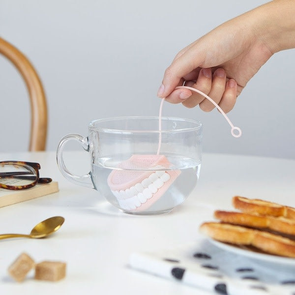 Découvrez l'infuseur à thé Teath pour une touche d'originalité lors de votre pause thé ! Disponible dans une délicate teinte rose, cet infuseur à thé en silicone simule de manière amusante un dentier.
